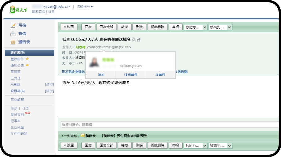 员工离职时,企业邮箱可以顺利收回,从而将所有业务联系保留和延续下来。避免因使用个人邮箱,员工离职后利用个人邮箱的联系方式将客户一并带走。
